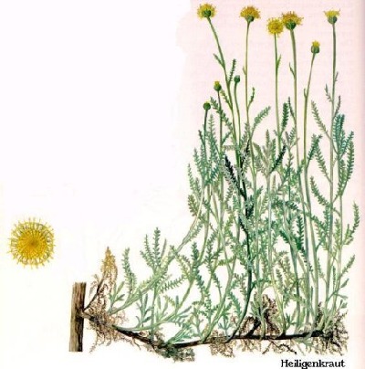 Heiligenkraut (Santolina chamaecyparissus L.) Die Heilwirkungen der Pflanze waren schon im Altertum bekannt. Ihre blühenden Spross-spitzen, die im Juli gepflückt werden, wirken stimulierend und magenstärkend, der Aufguss hilft vor allem bei Magenkrämpfen. Die Samen gelten als Wurmmittel. Im Französischen führt es auch den Beinamen «Garderobe», weil es Kleider und Wäsche vor Motten schützt. Bei Insektenbissen hilft eine Auflage aus zerdrückten Blättern dieses Krautes.Geschmack bitter, aromatisch. Bündchen ca.30 gr. ...1,90€